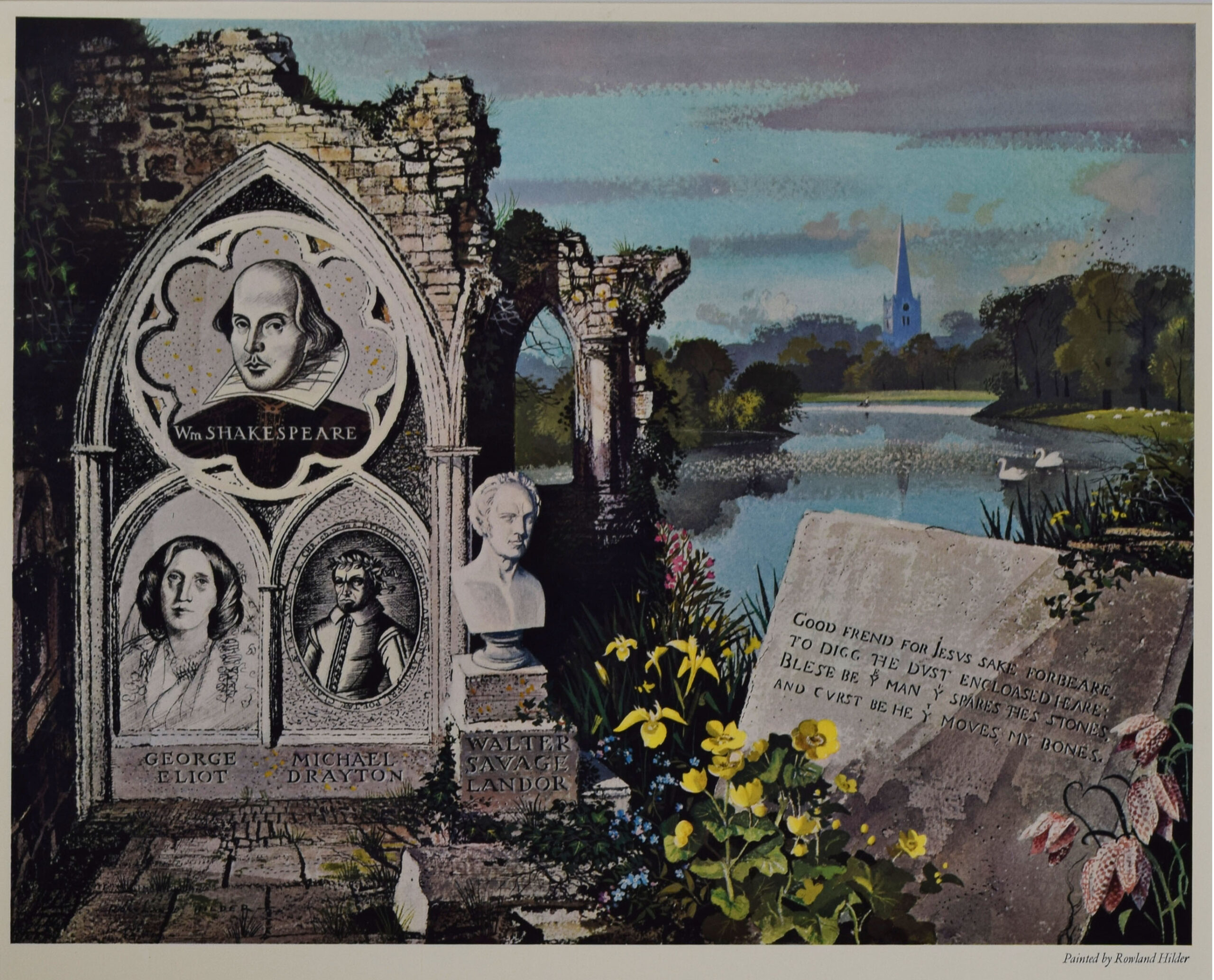 Rowland Hilder was a well known landscape artist and book illustrator. Born in New York state, his English father moved the family to Kent, England in 1915. It was here his natural talent for drawing was noticed by his school. Later Hilder went to study at Goldsmith’s College in London. He was well known as an accomplished watercolorist, particularly in his sensitive handling of the sky and earth. Between 1964 and 1974 he was president of England’s Royal Institute of Painters in Watercolours.